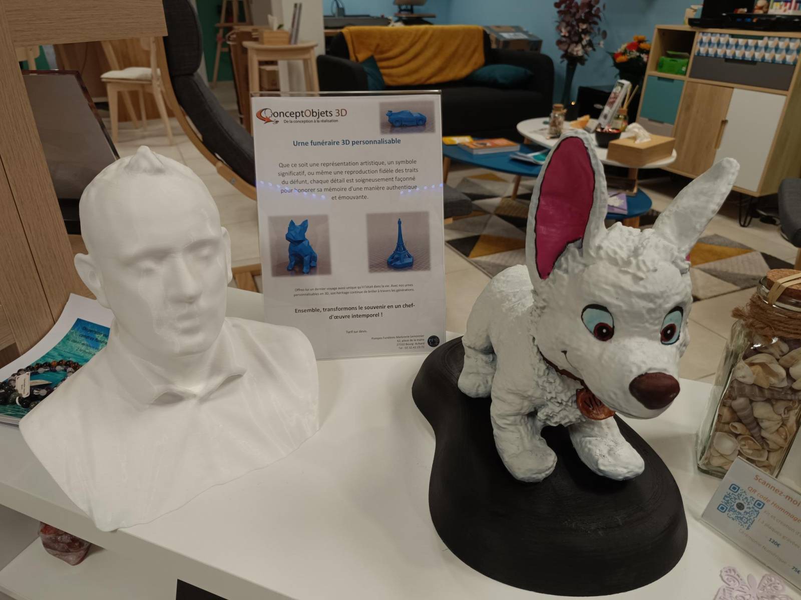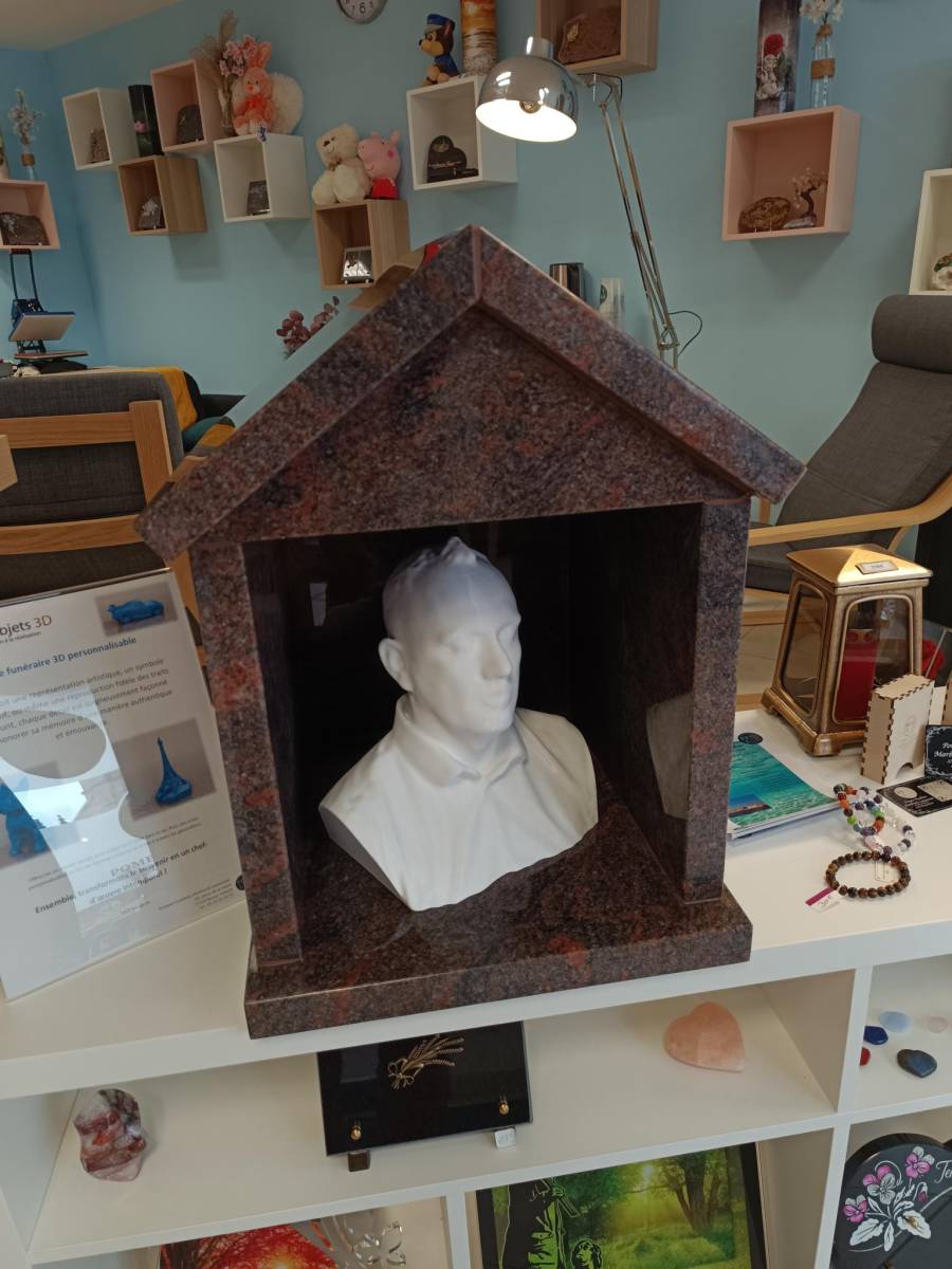 Grâce à des technologies innovantes, telles que le scannage 3D, nous pouvons reproduire fidèlement un objet précieux, une main ou même un visage. Chaque détail est pris en compte pour créer une urne qui honore la mémoire du défunt avec possibilité d'une mise en peinture. À titre d’exemple, nous avons récemment conçu une urne à partir d’une peluche chère au cœur de l’être disparu. Ce type de personnalisation permet à la famille de conserver un souvenir profondément symbolique. (conservation de l'urne en concession dans un cimetière, dans une chapelle par exemple)